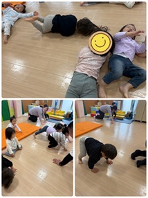 ♪ミックスジュースのうた♪で準備体操をした後、はじめはマットを使った「引っ越しゲーム」をしました。うま、・ライオン・ヘビ・おいもに変身!